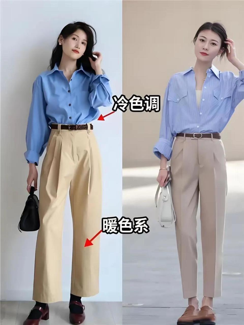 也可以选择向下面用冷色调的衬衫上衣搭配上暖色系的直筒阔腿裤,浅蓝色的衬衫和卡其色的直筒裤面料都挺括有型,而且配色也很时髦,咱们就算照着穿,也能轻松摆脱路人感。