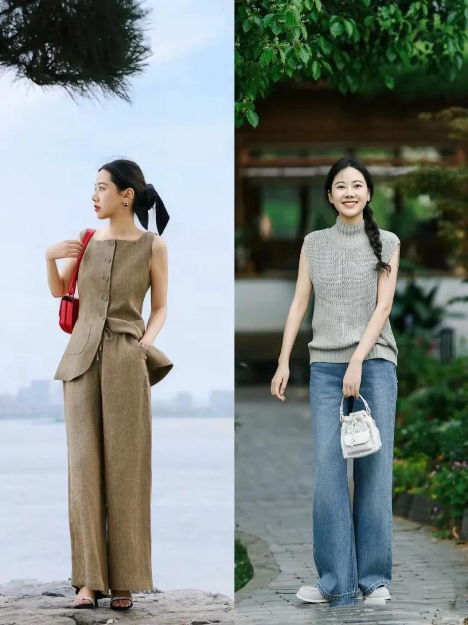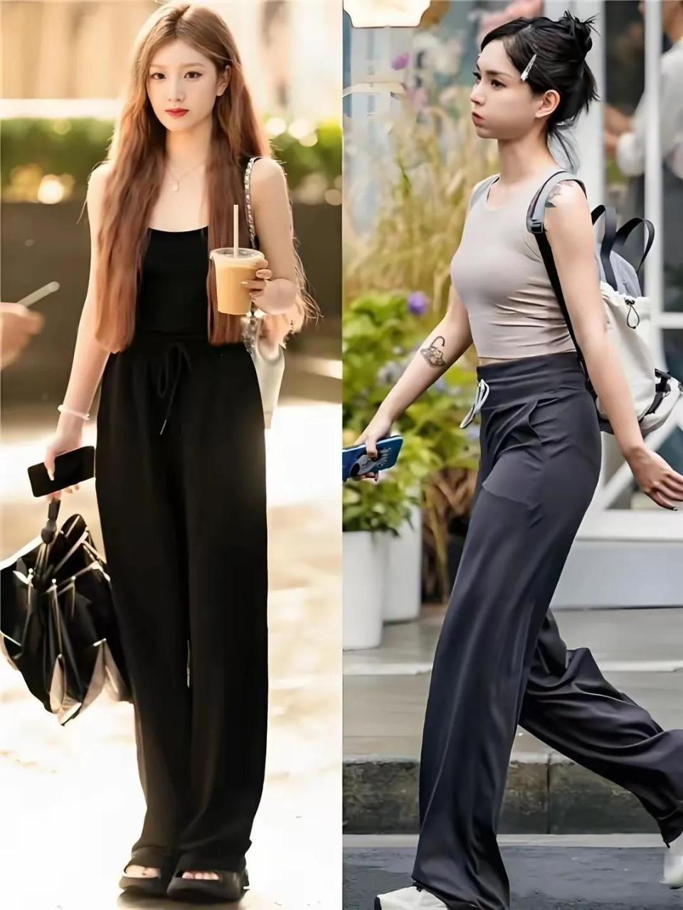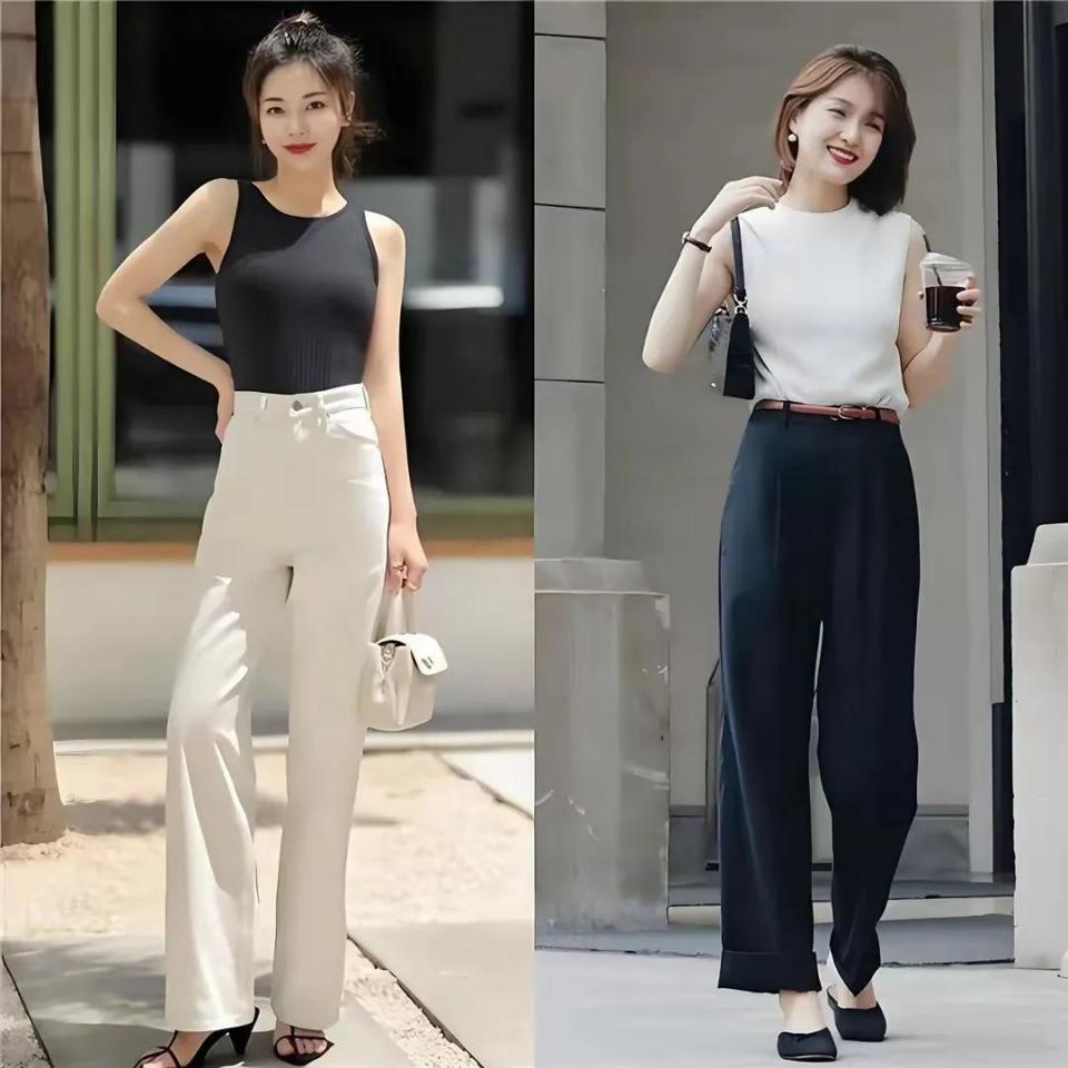咱们就看下面这位博主选择的不同面料的阔腿裤,搭配了无袖的上衣,脚上穿的高跟凉鞋,或者是平底单鞋,这2套穿衣打扮都显得通勤时髦,不管是中年女性还是美少女,选择这样的穿衣打扮都比较好看。