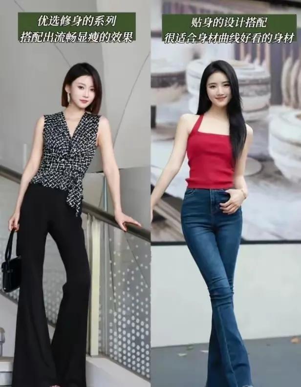 当然啦,如果你的身材比例保养的很不错,这时候还可以选择上紧下松的穿搭方式,类如下面红色的吊带上衣,设计属于修身款,穿在身上能更好地展现出自己凹凸有致的身材比例,下半身选择天下就拥有时尚元素的蓝色微喇叭牛仔裤,轻轻松松穿出时髦感。