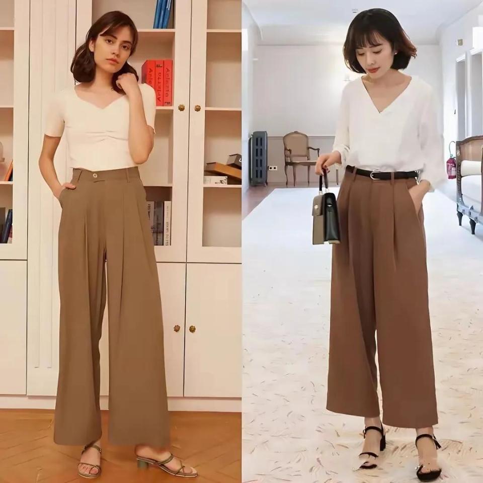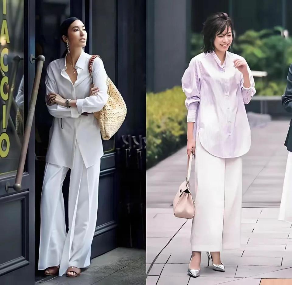 如果长相偏成熟的女性个人很推荐大家选择西装面料的阔腿裤来搭配上衬衫上衣,这样的穿衣打扮看起来会更干练,而且宽松的衬衫上衣比较遮肉,就算有水桶腰或者是有小肚腩都能遮住。