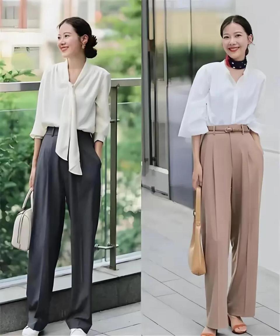想要整个套穿衣打扮更显高级,你也可以选择卡其色的西装裤来搭配白色的衬衫上衣,或者选择米白色的衬衫上衣搭配上灰色的西装裤,这样的配色比黑白稍微不那么正式感。