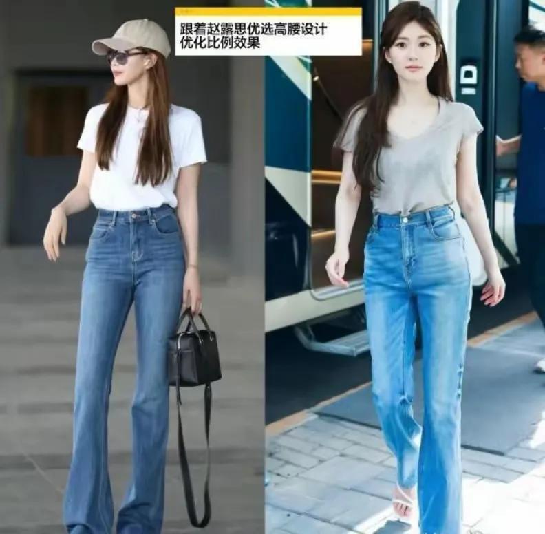 也可以学习女明星赵露思的穿衣打扮,用高腰收腰款的牛仔裤来搭配上灰色的短袖上衣,把上衣的衣角塞进裤子里面就能很好的提升腰线,显高显瘦自然不在话下。